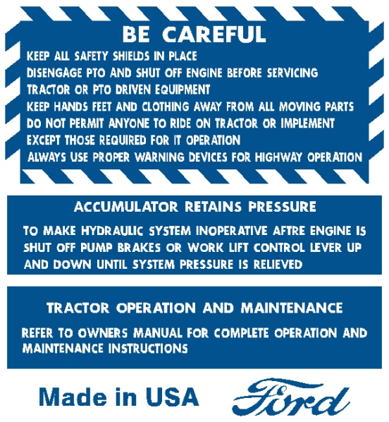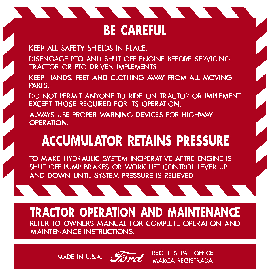 | Be Careful, safety decal, on dash underneath steering and instruments. Used on early 6000, red and gray tractors. 1965-67. |
