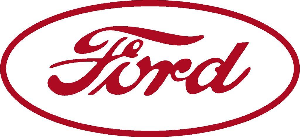 | Ford Script Decal, used on front bumpers, post drivers, and other applications. 1-3/4" x 4-1/10". Shown on red background to help identify the color of the decal |
